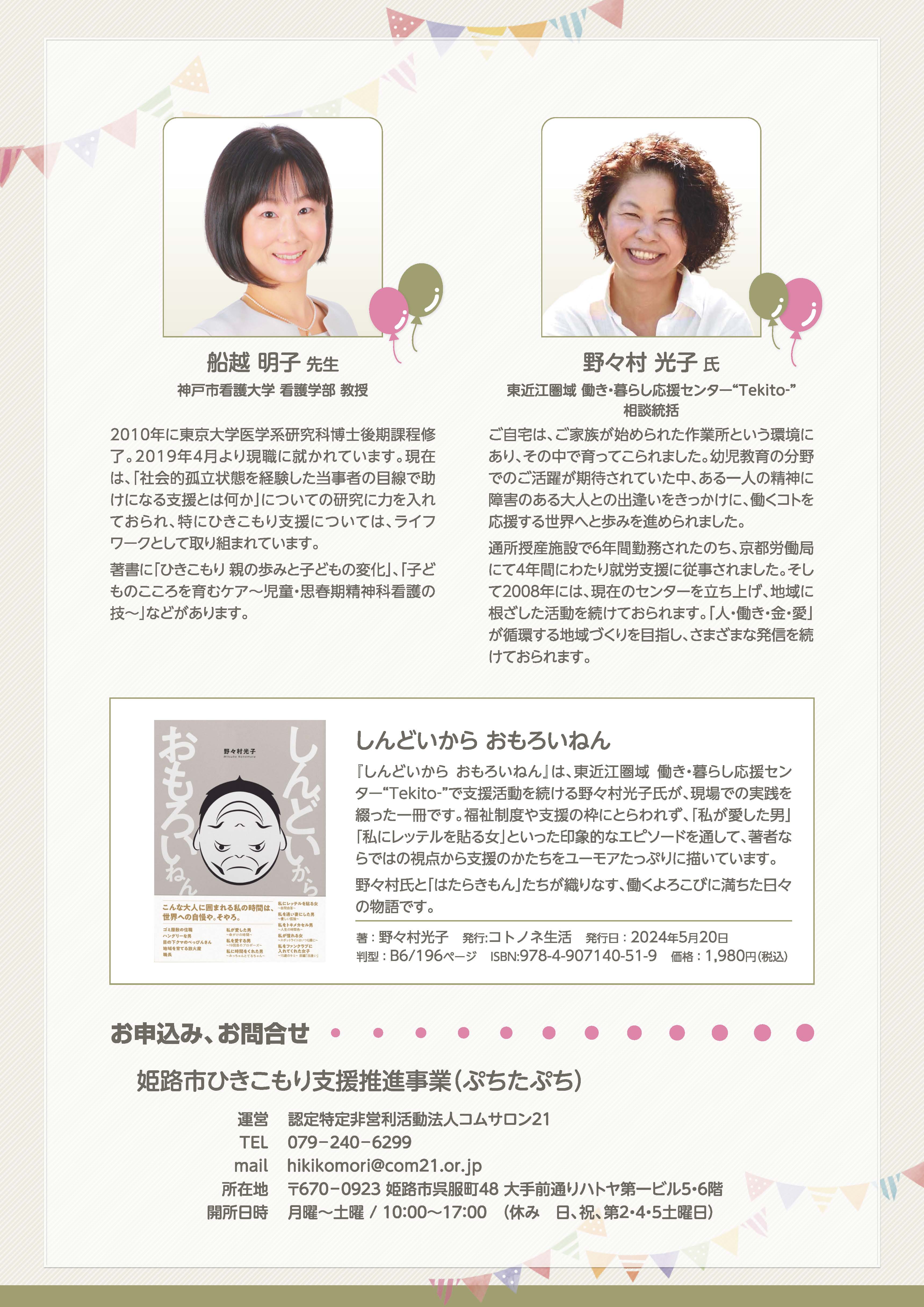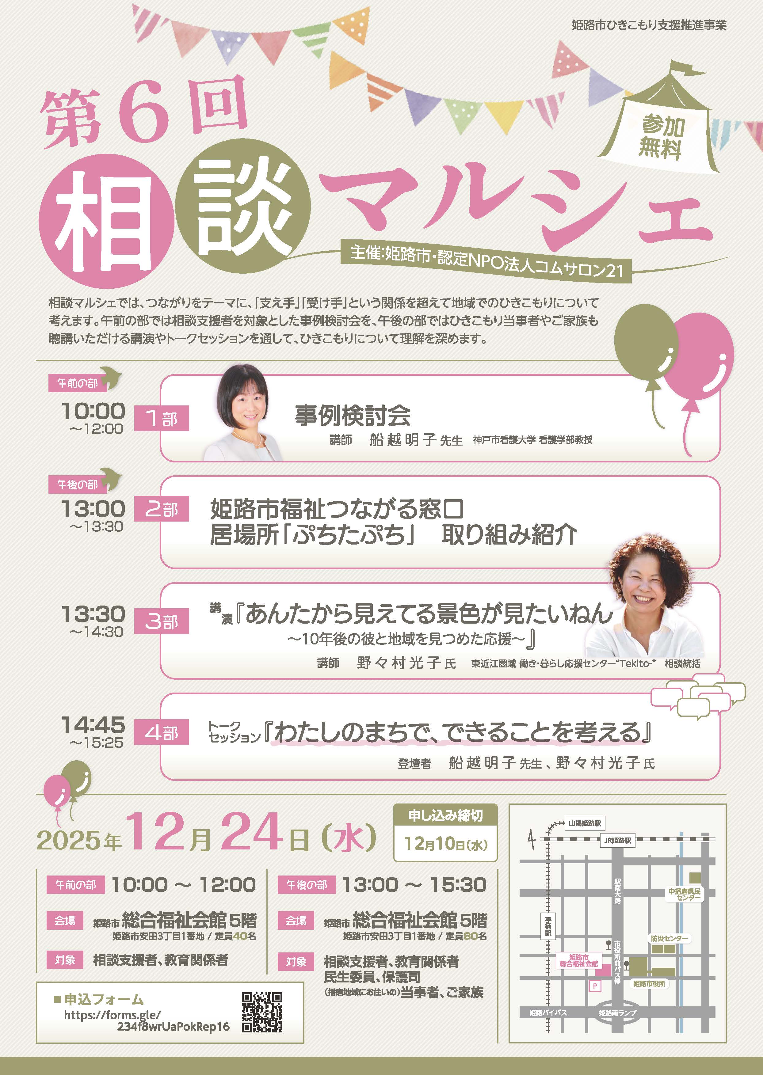 午前の部では相談支援者を対象とした事例検討会を、午後の部ではひきこもり当事者やご家族も聴講いただける講演やトークセッションを通して、ひきこもりについて理解を深めます。